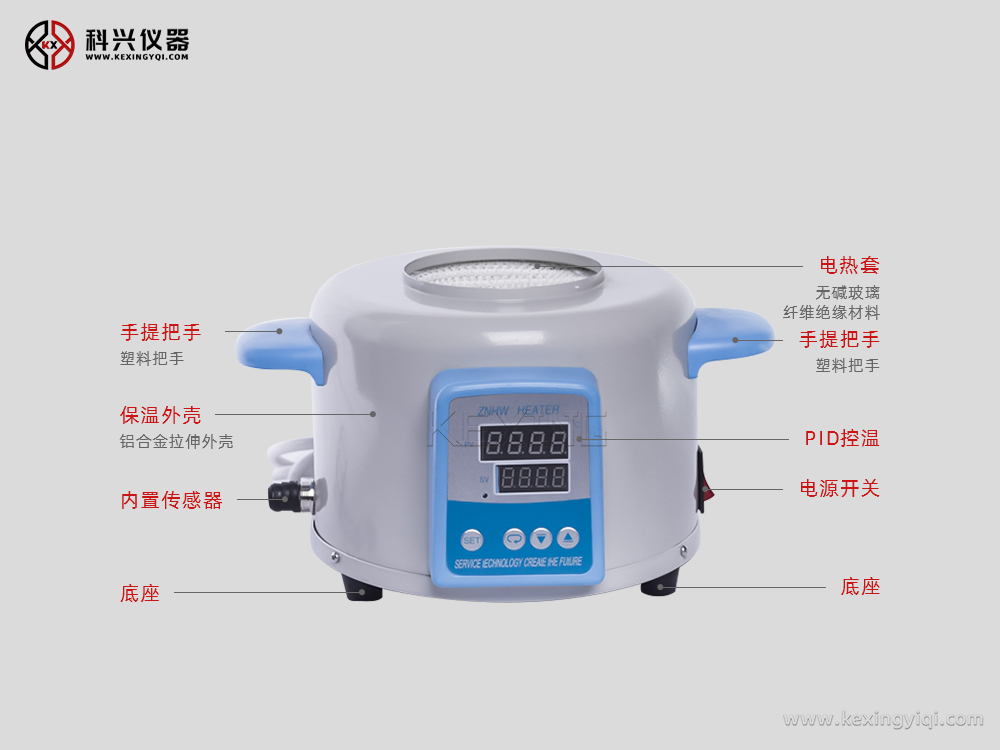 ZNHW型電熱套是用無堿玻璃纖維作絕緣材料,將Cr20Ni80合金絲簧裝置于其中,用硅酸鋁棉經真空定型的半球形保溫體保溫,外殼一次性注塑成型,上蓋采用靜電噴塑工藝,由于采用球形加
